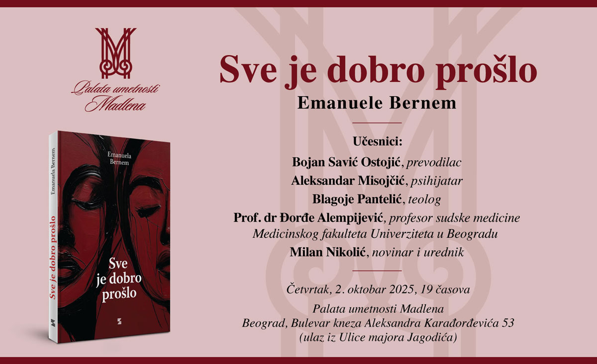 U Palati umetnosti Madlena, 2. oktobra 2025. godine, u 19 časova, održano je književno veče posvećeno romanu Sve je dobro prošlo francuske autorke Emanuele Bernem. U dirljivom i otvorenom razgovoru, učesnici su se osvrnuli na temu dostojanstvenog kraja života, slobode izbora i granica ljubavi — pitanja koja Bernem postavlja sa izuzetnom snagom i preciznošću.